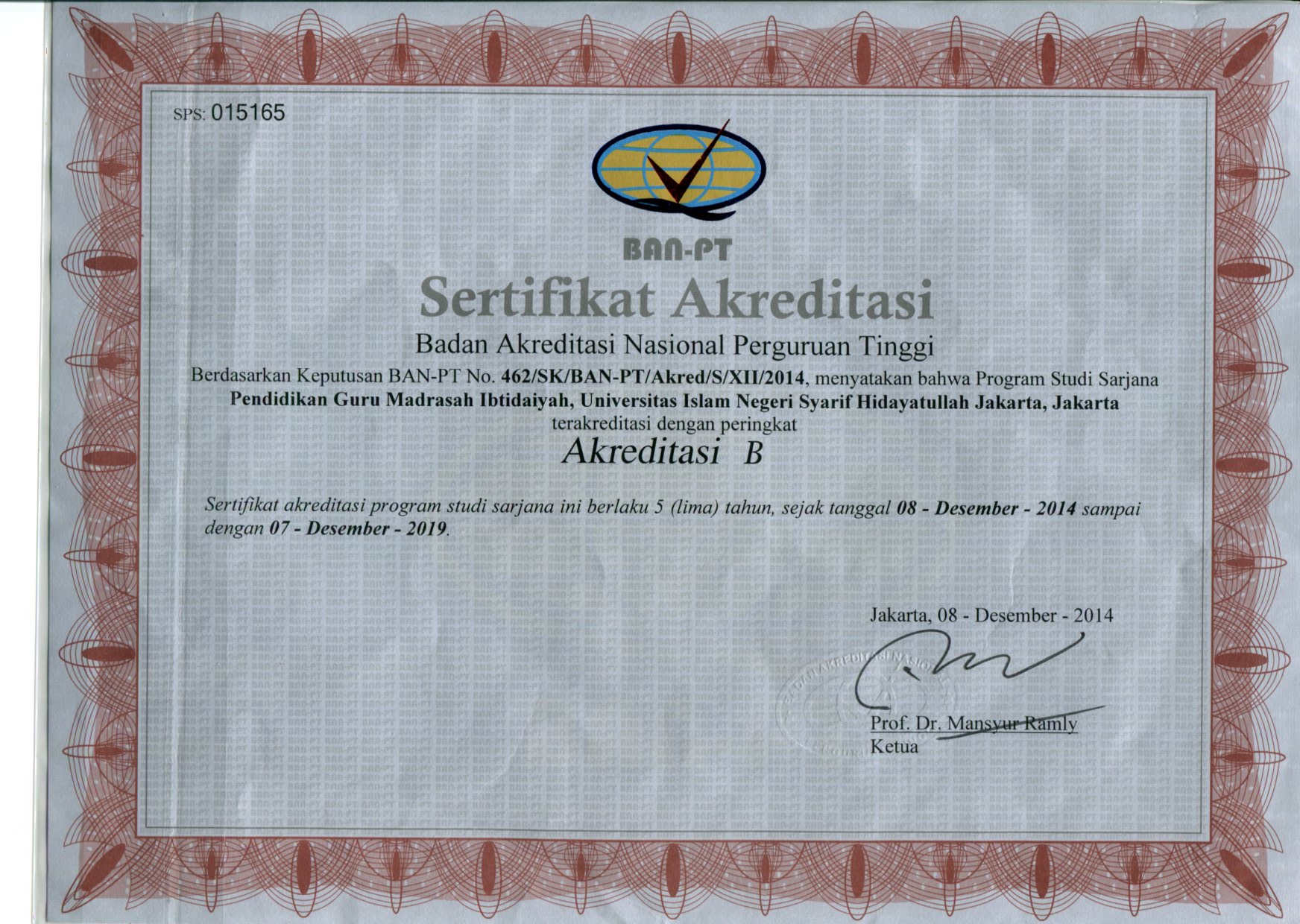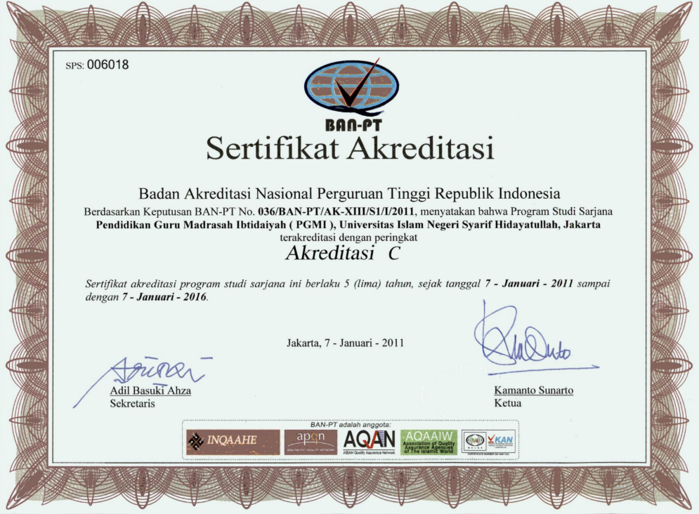 Program Studi Pendidikan Guru Madrasah Ibtidaiyah (PGMI) Fakultas Ilmu Tarbiyah dan Keguruan UIN Syarif Hidayatullah Jakarta telah terakreditasi A (Sangat Baik) oleh Badan Akreditasi Nasional Perguruan Tinggi (BAN-PT).